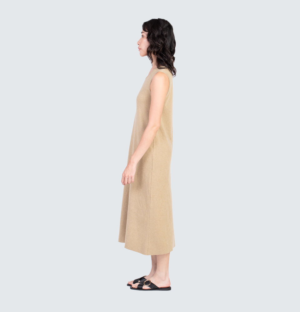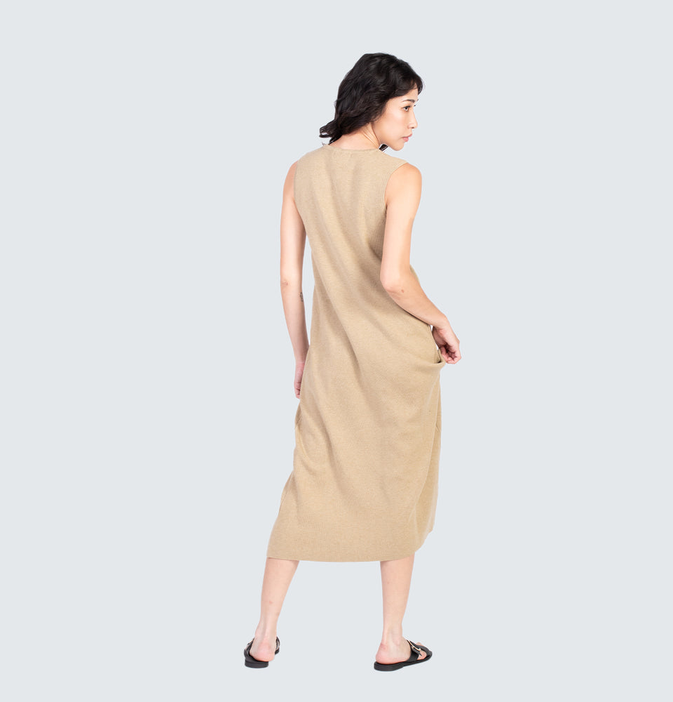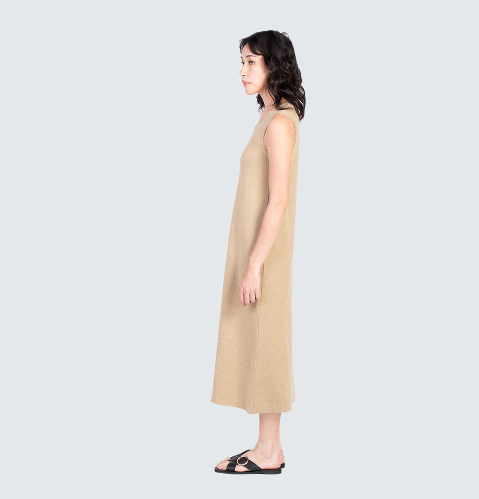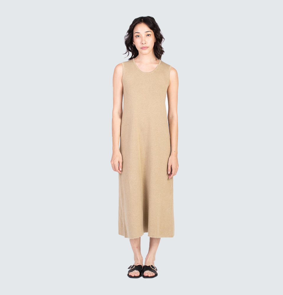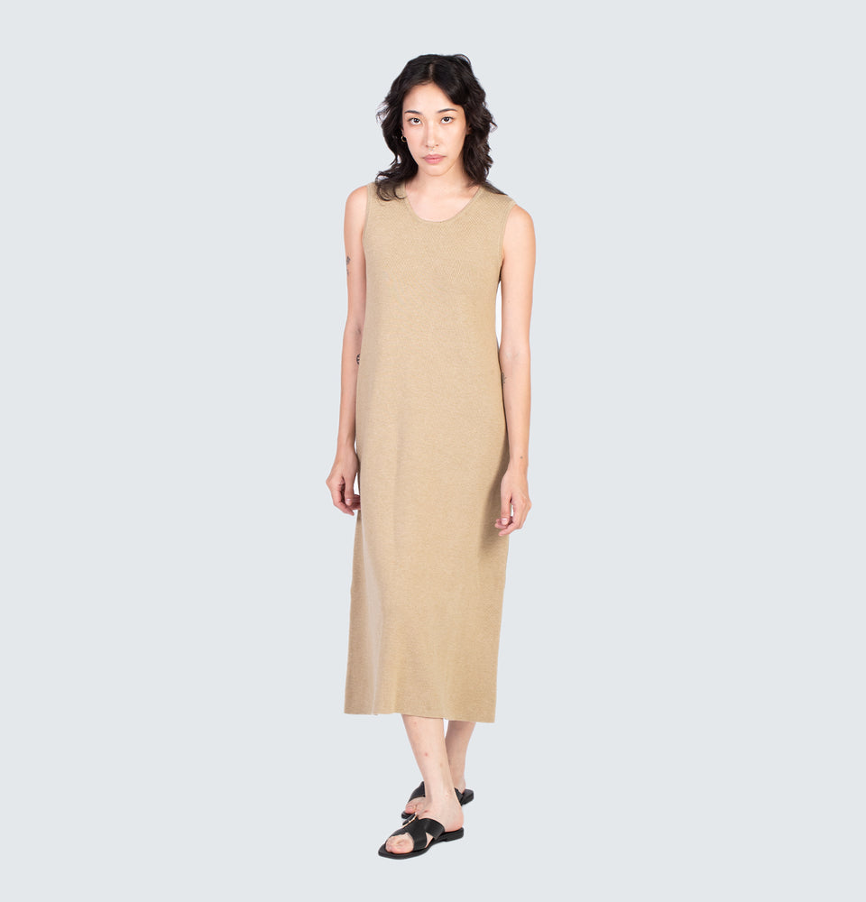 Description: Sleeveless, stretchable Round neck sleeveless dress. Features a fitted waist and a flared hem. .