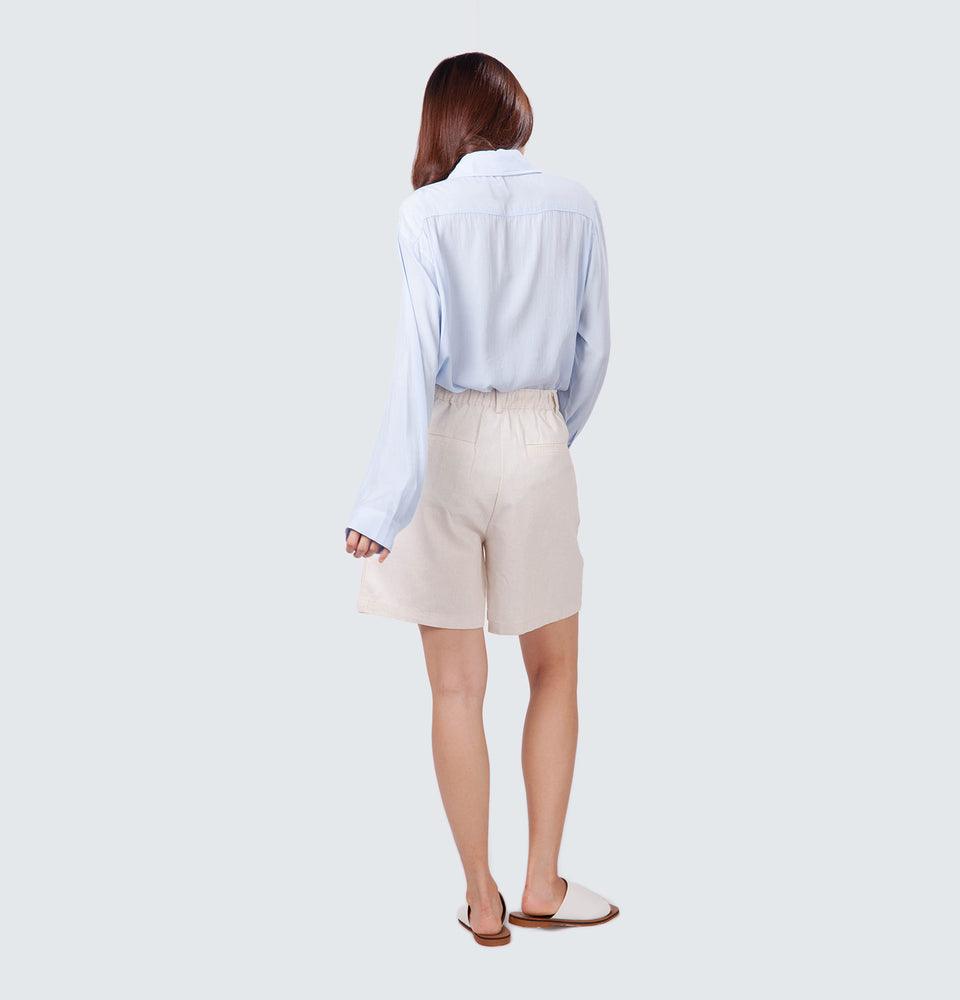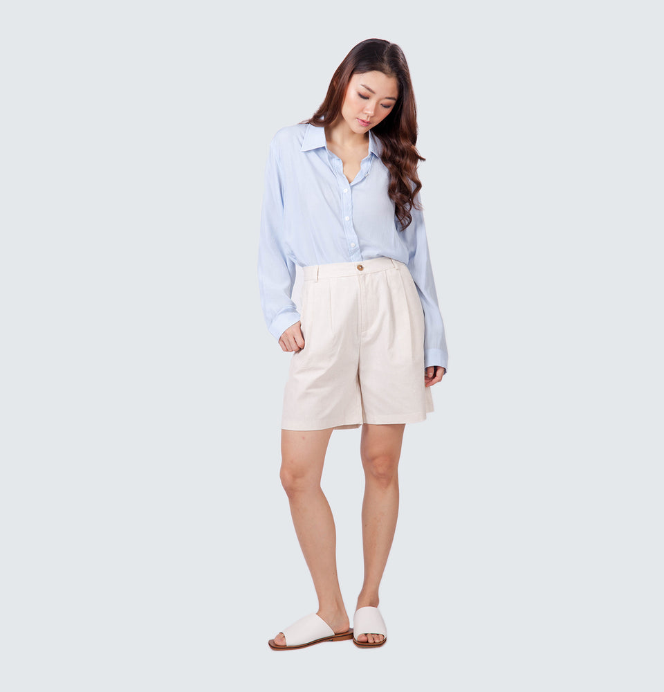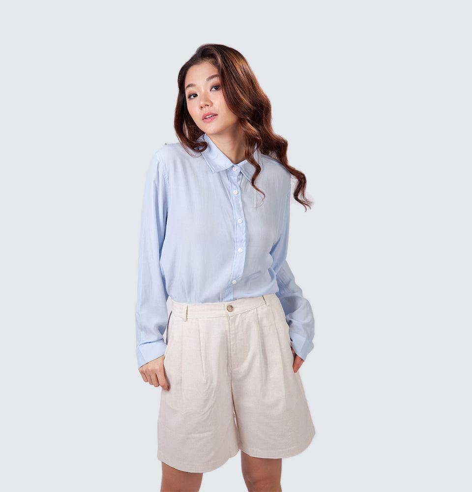 Description: Flowing collared shirt with long sleeves. Side vents at the hem. Button-down front hidden by a placket.