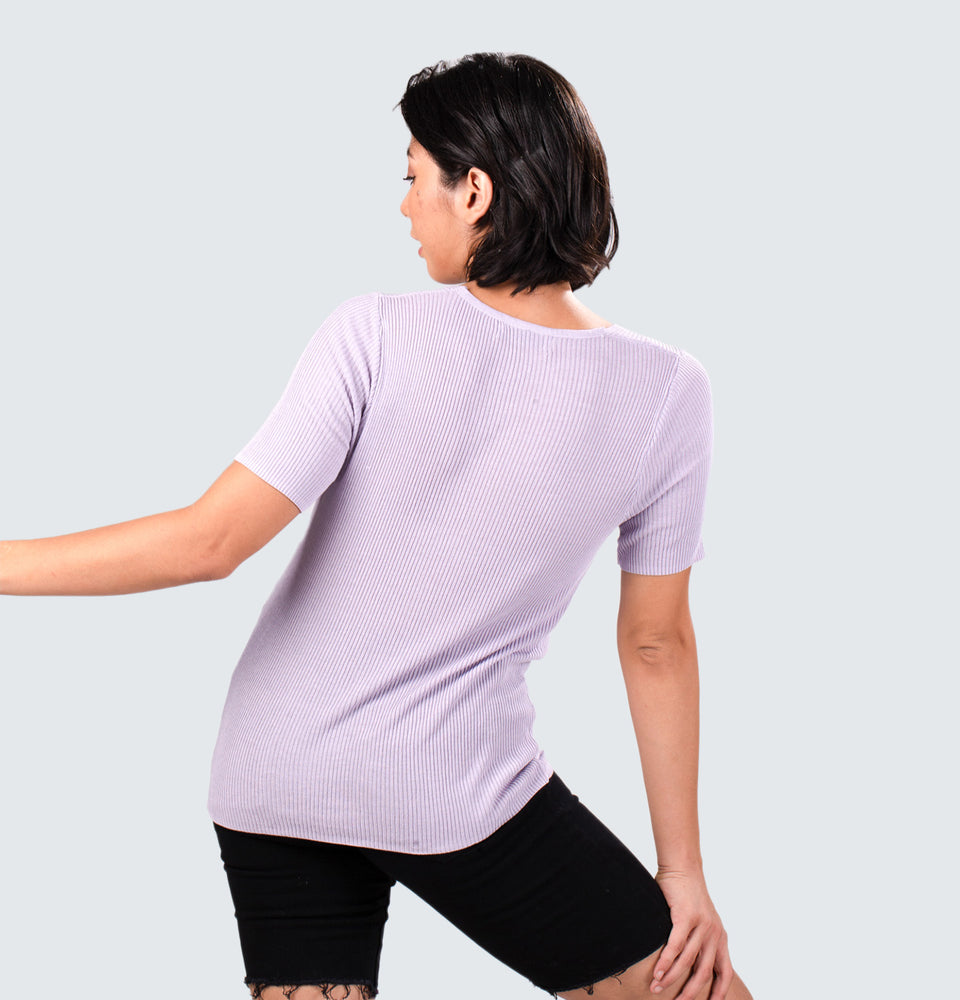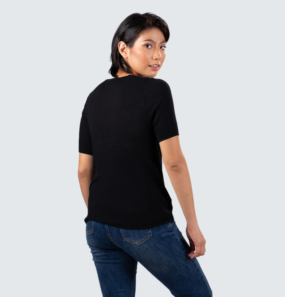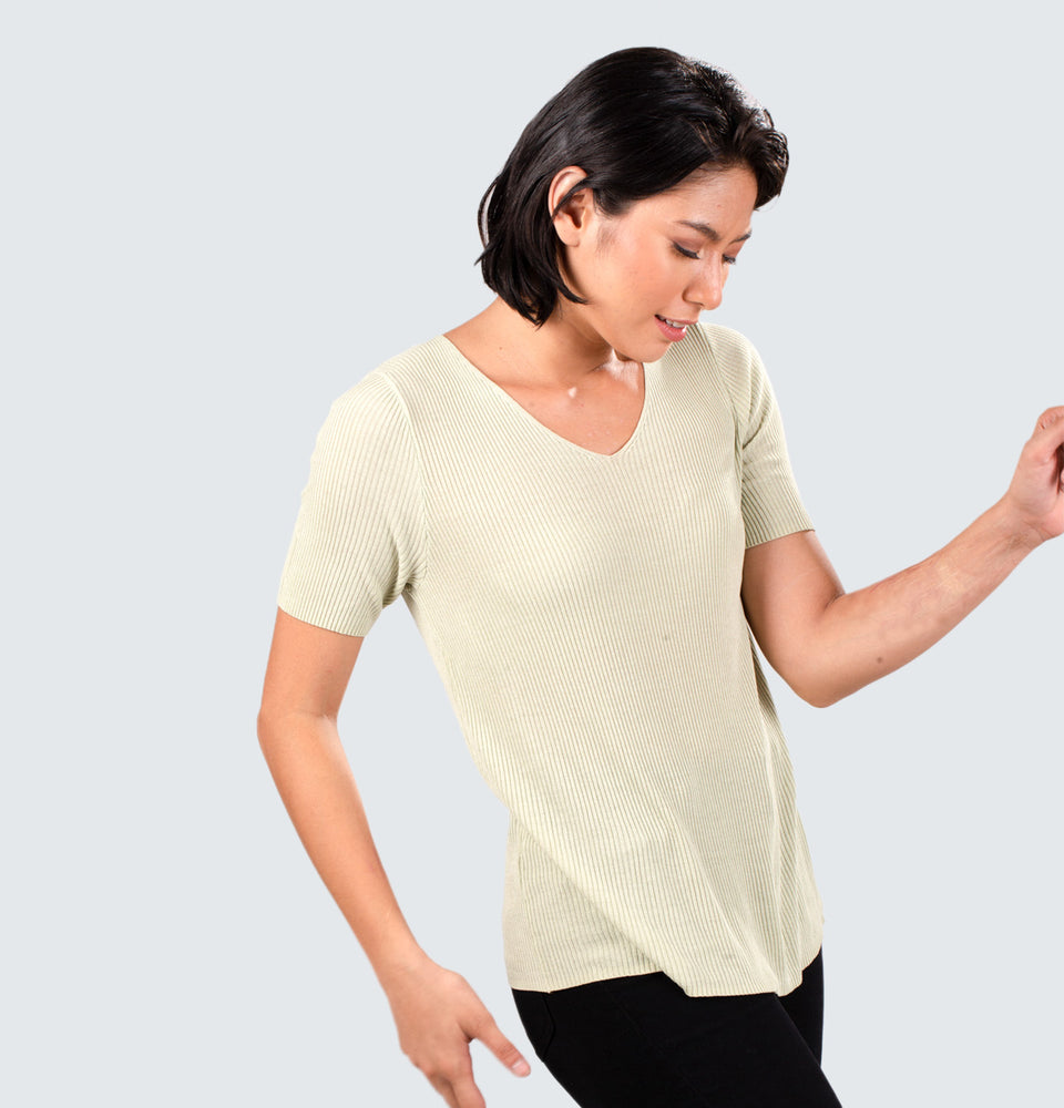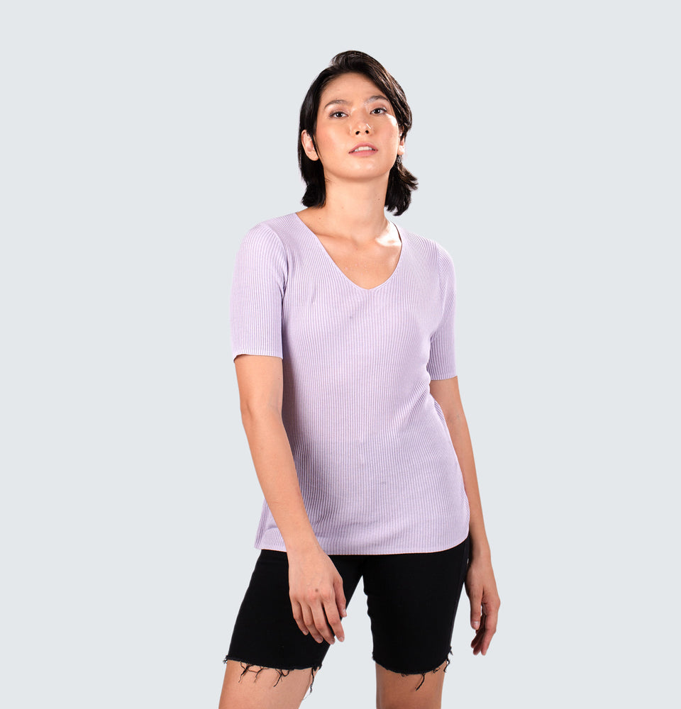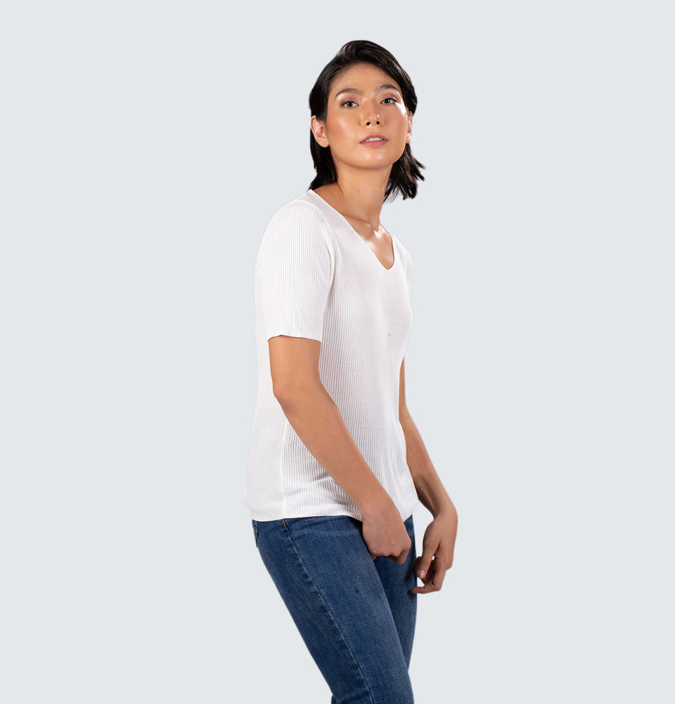 Description: V-neck T-shirt with short sleeves and ribbed trims.