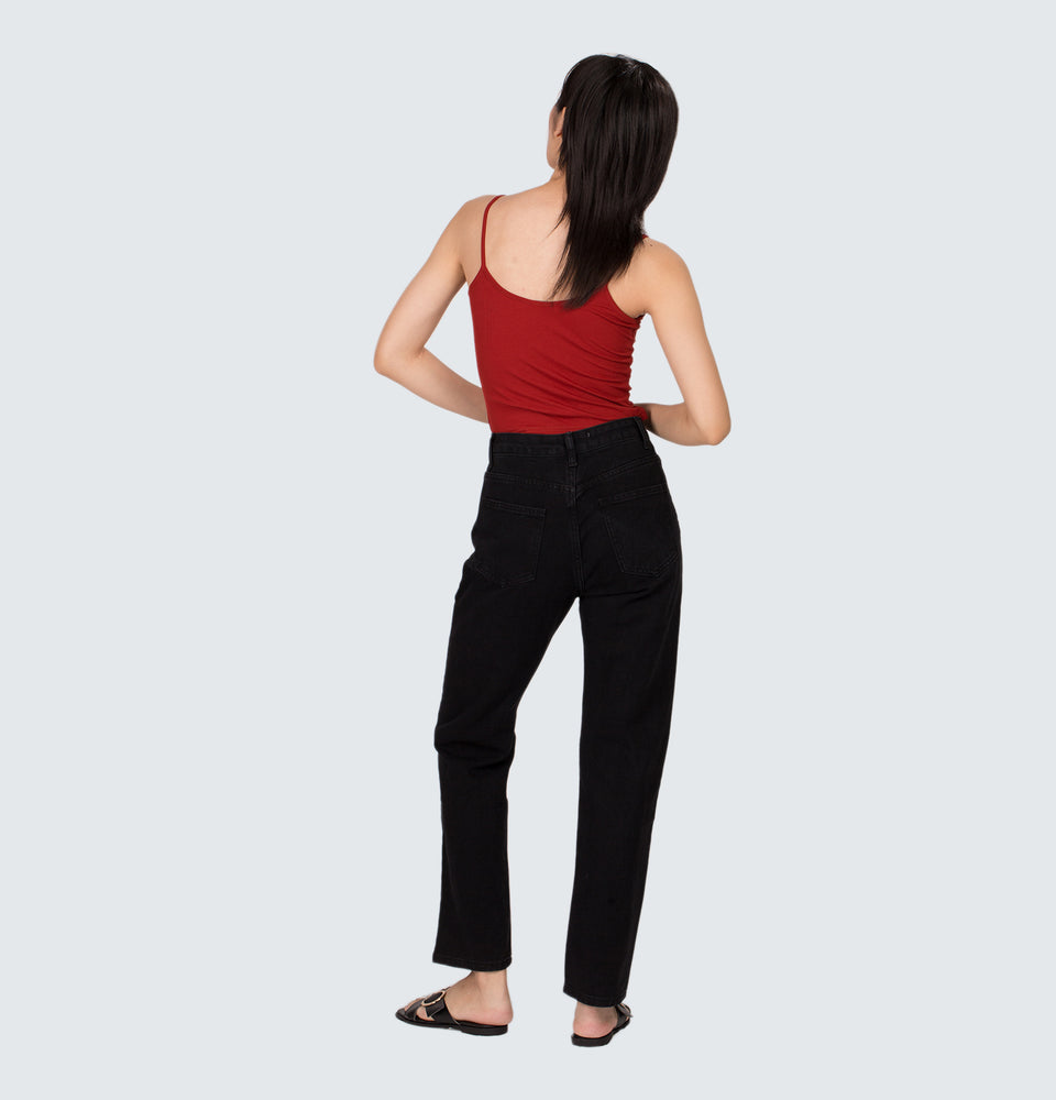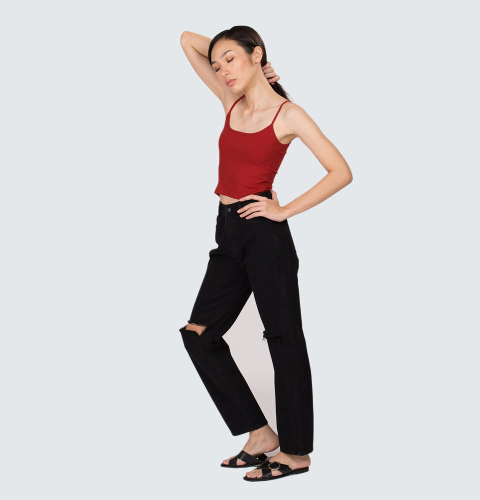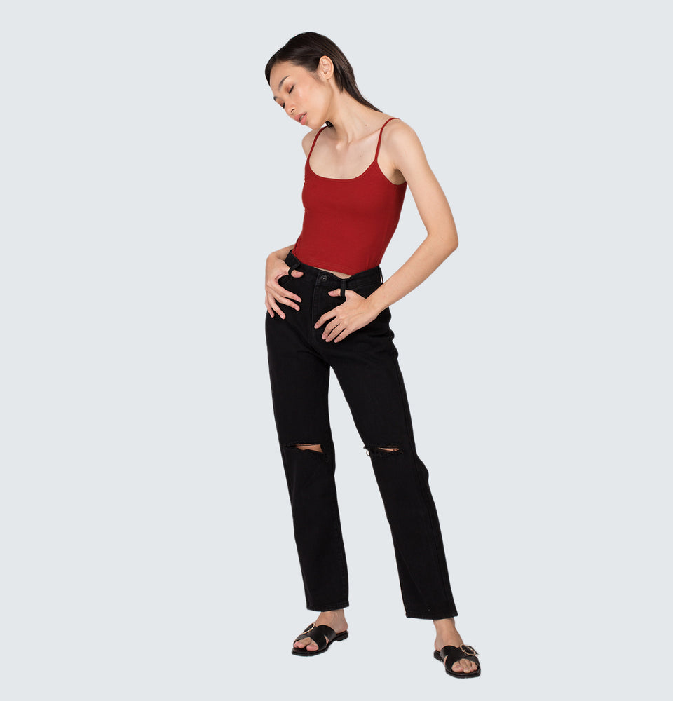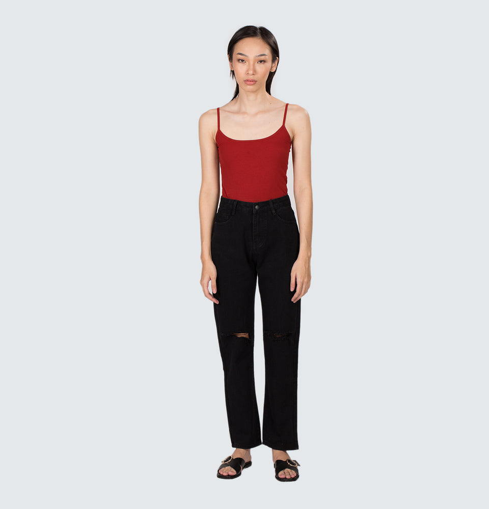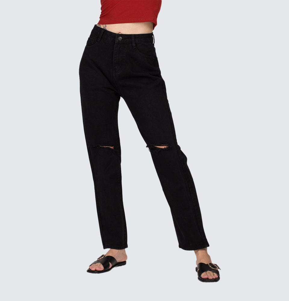 Description:  High-waist jeans rigid jeans. Five-pocket design. Ripped details with a front zip fly and metal button fastening.