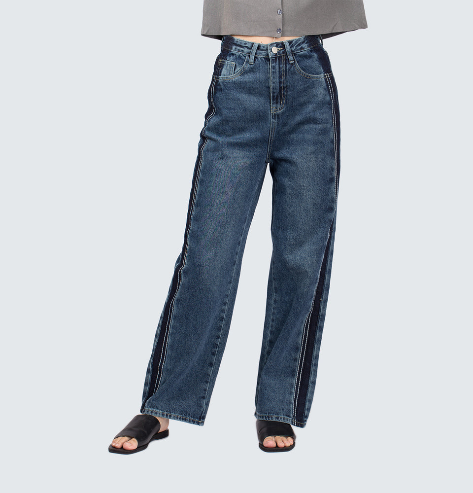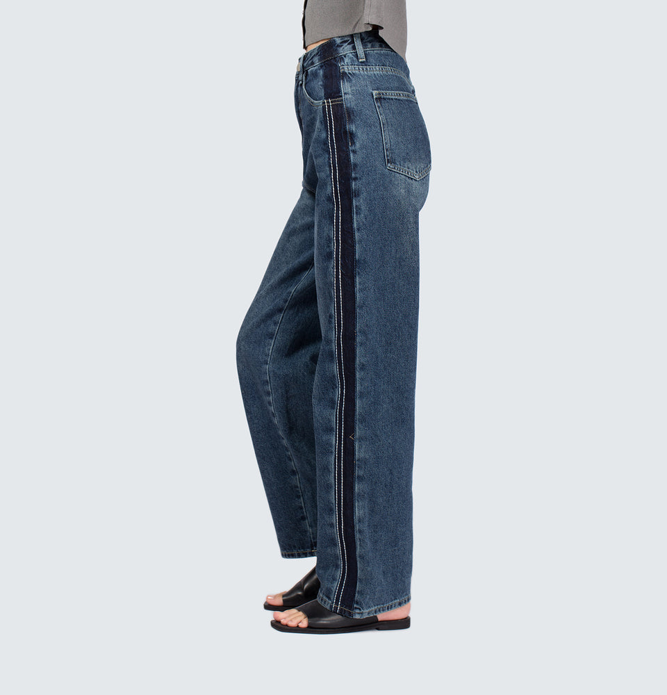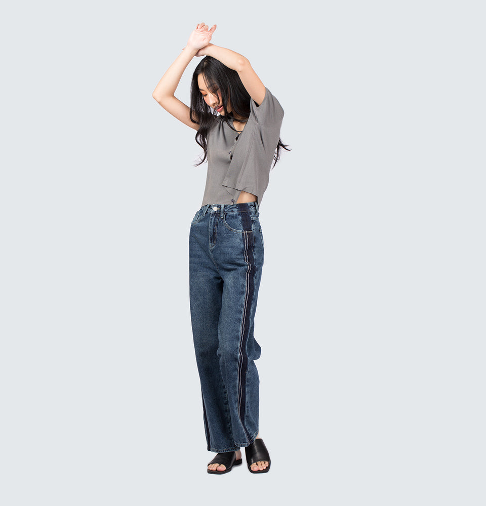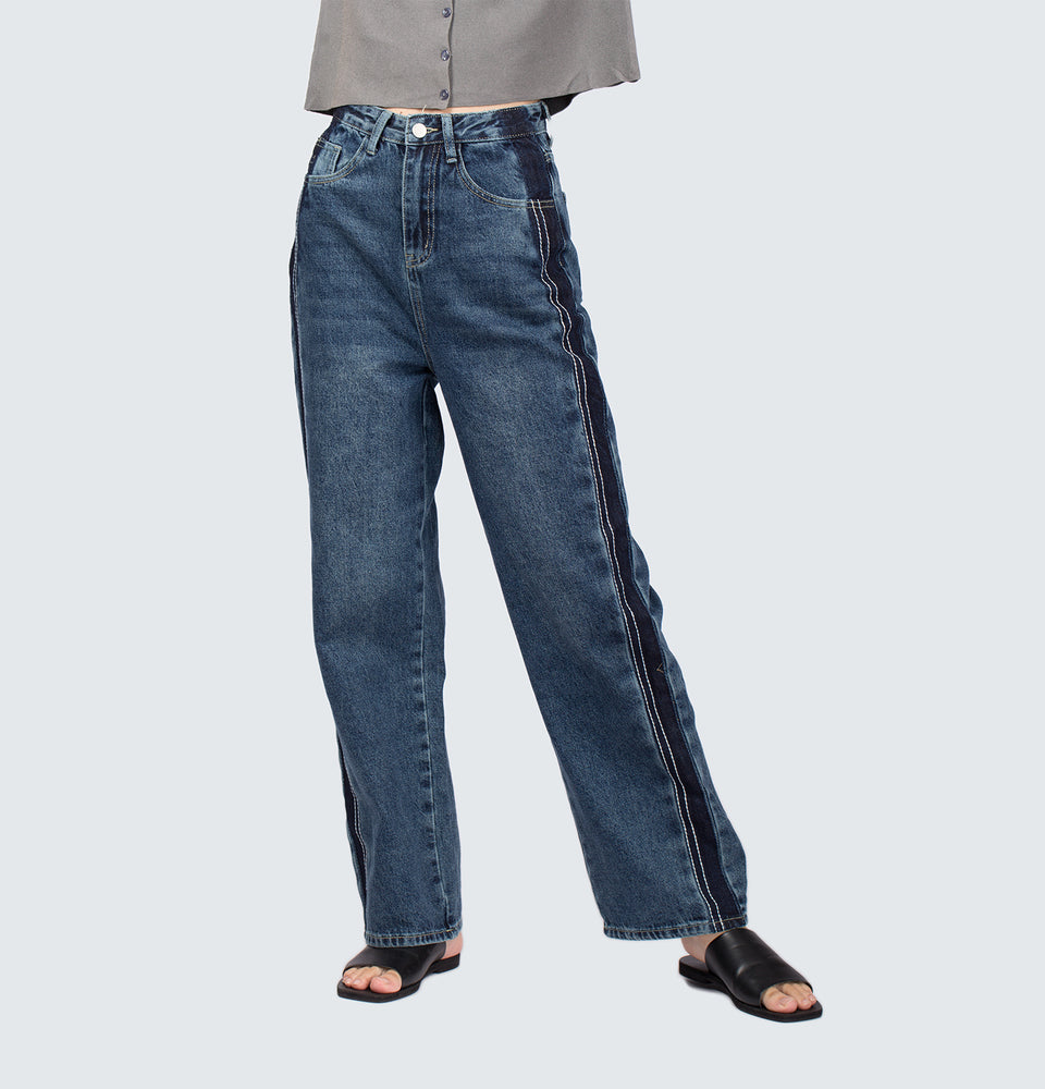 Description:  High-rise jeans with front pockets and back patch pockets. Visible seams. Zip fly and top button fastening.