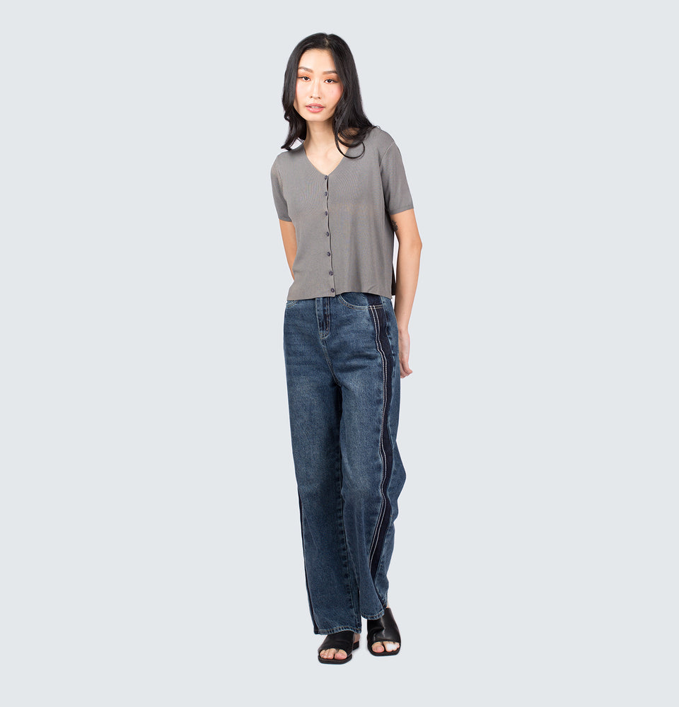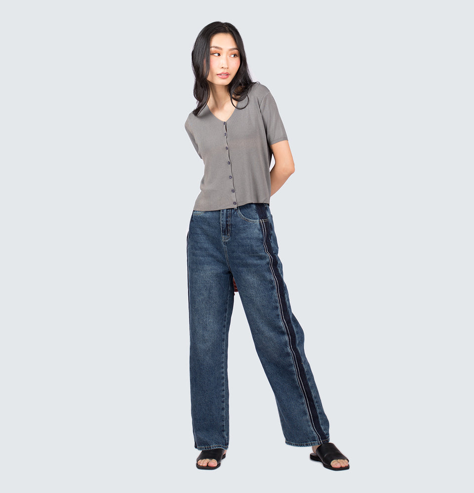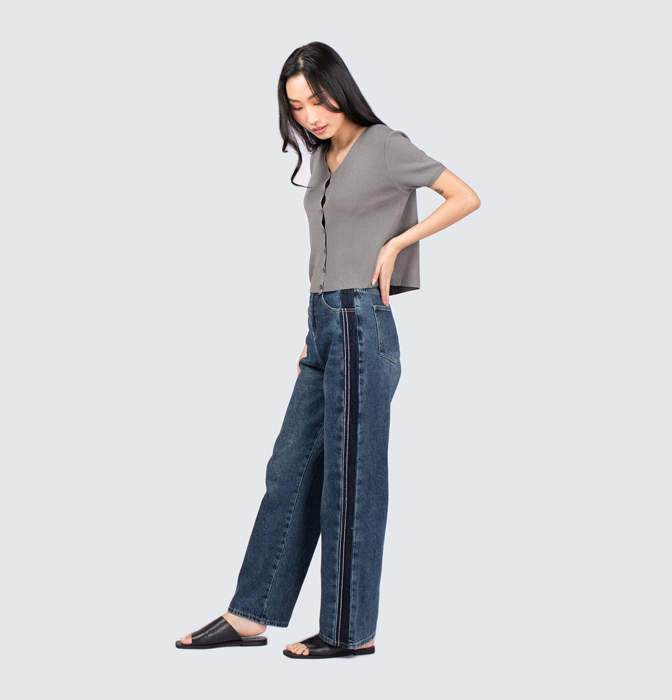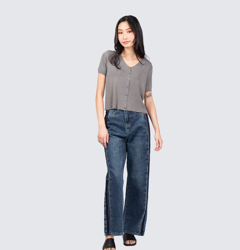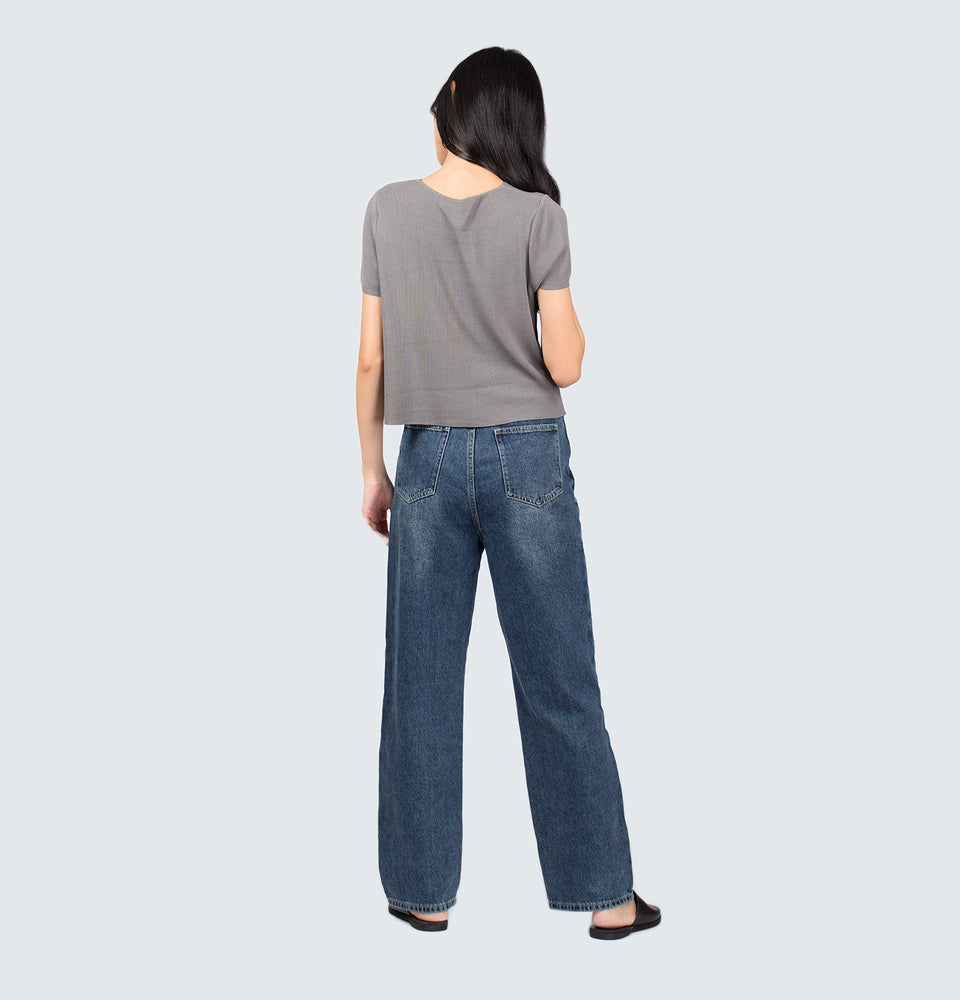 Description:  High-rise jeans with front pockets and back patch pockets. Visible seams. Zip fly and top button fastening.