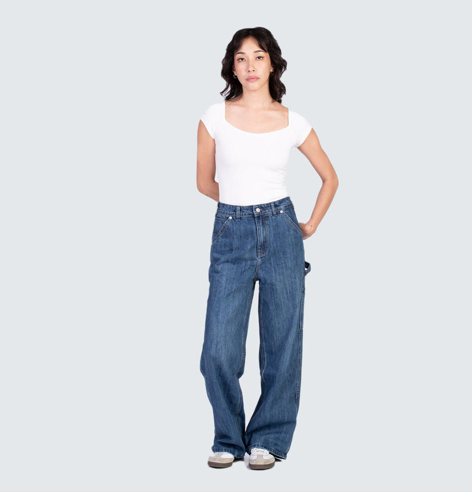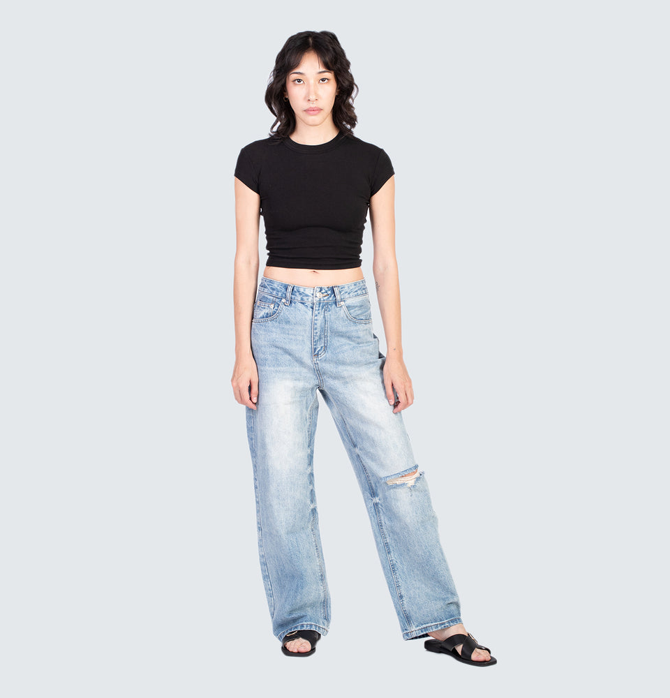 Description: Faded high-rise jeans with a five-pocket design. Featuring ripped detailing on the front, a zip fly and metal top button fastening