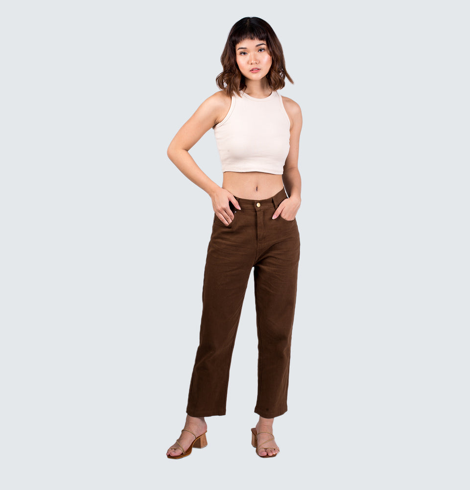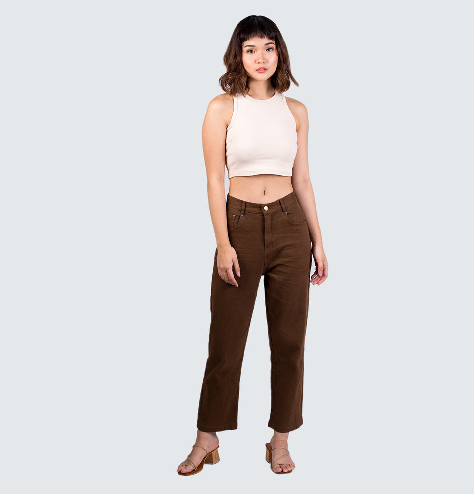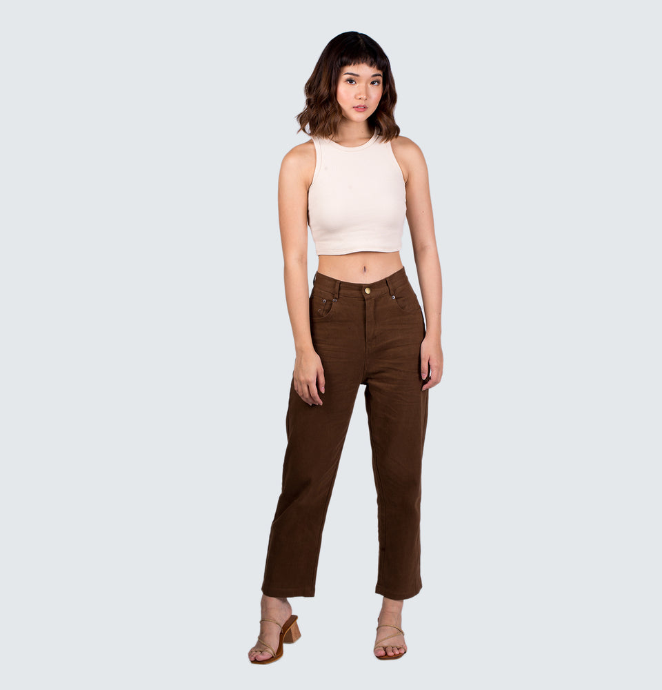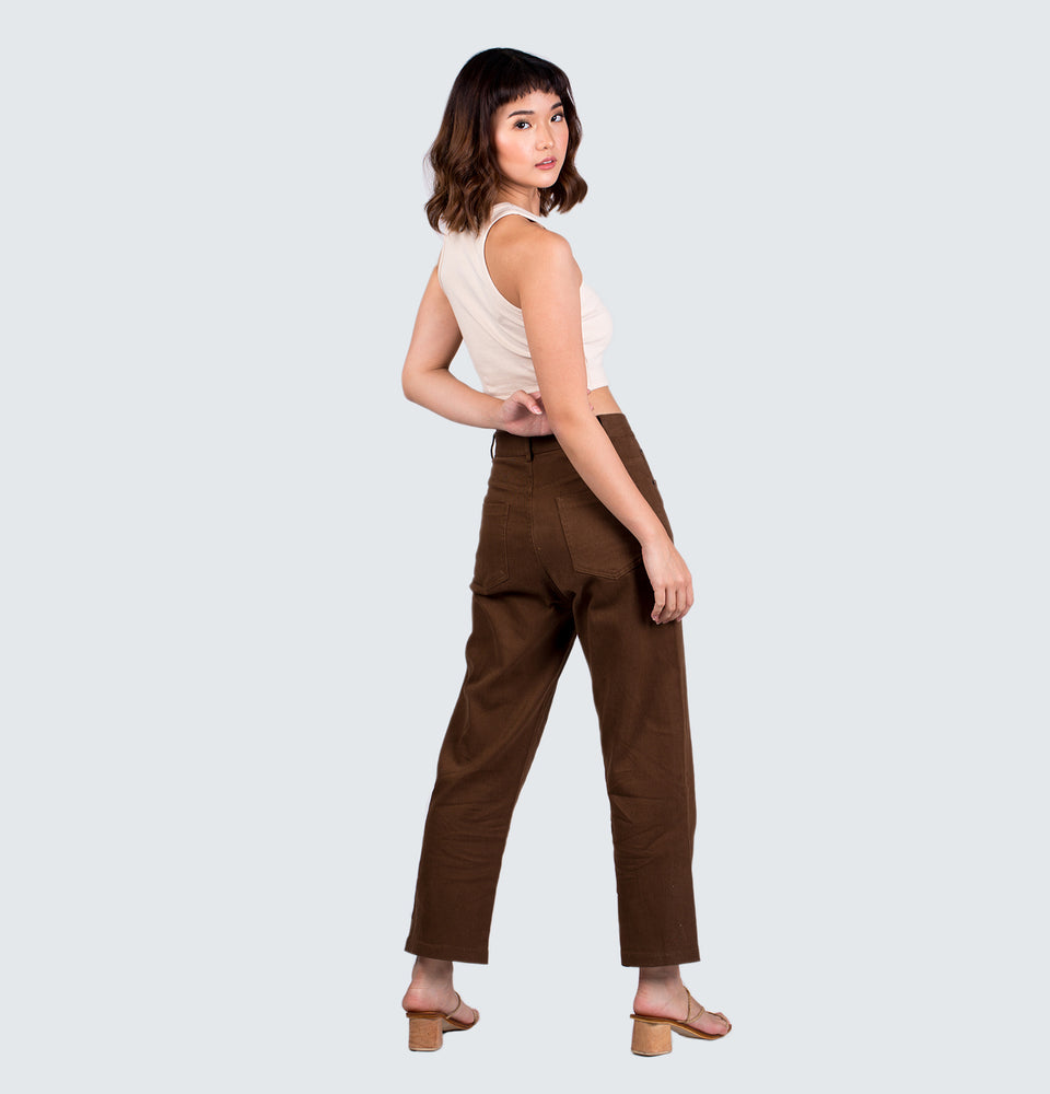 Description: High-rise jeans with a five pocket design. Zip fly and metal top button fastening