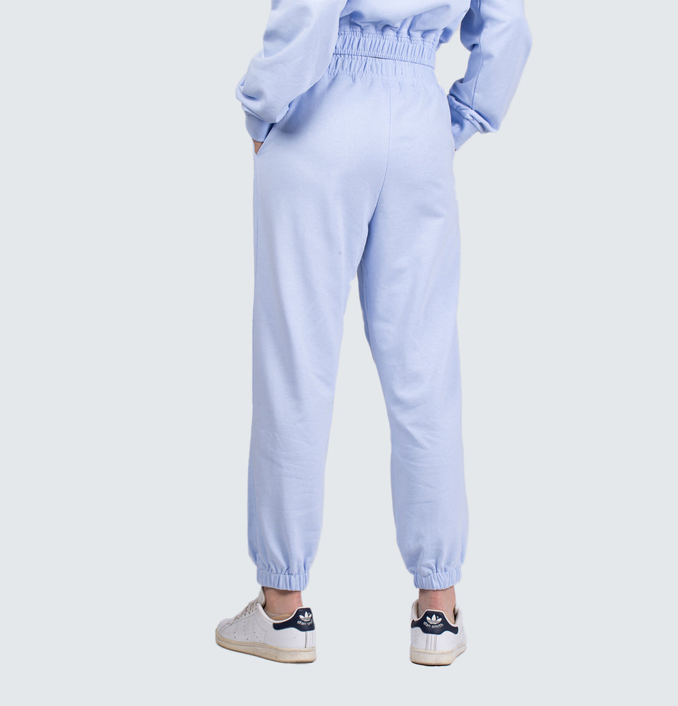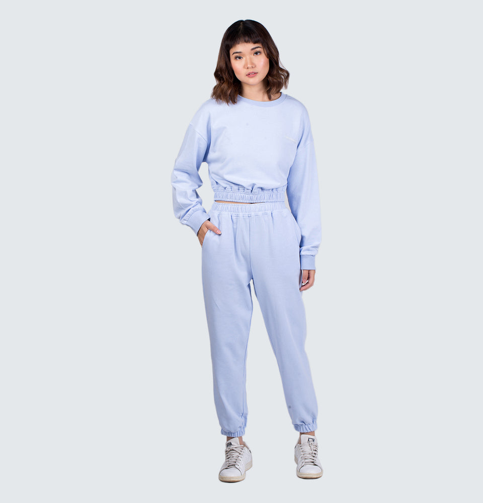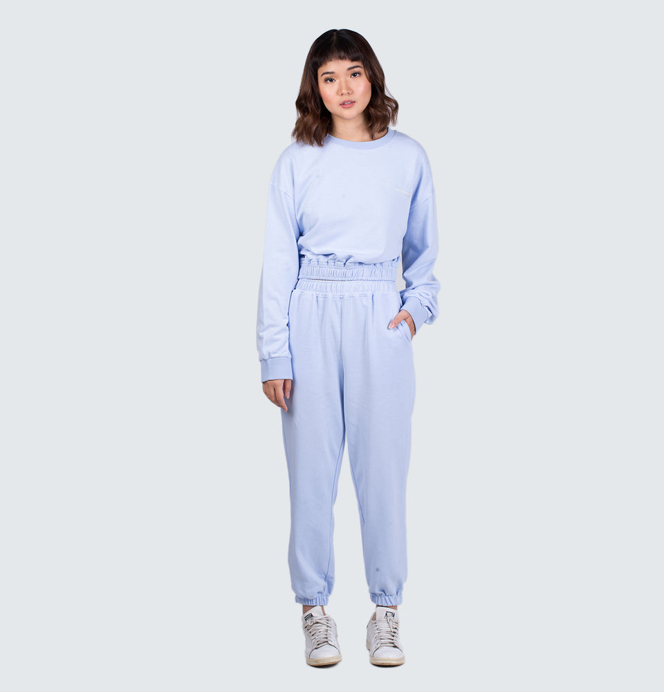 Description: Long sleeve sweatshirt with a round neckline and high-waist trousers featuring and elastic waistband, side pockets and elastic cuffed hems.