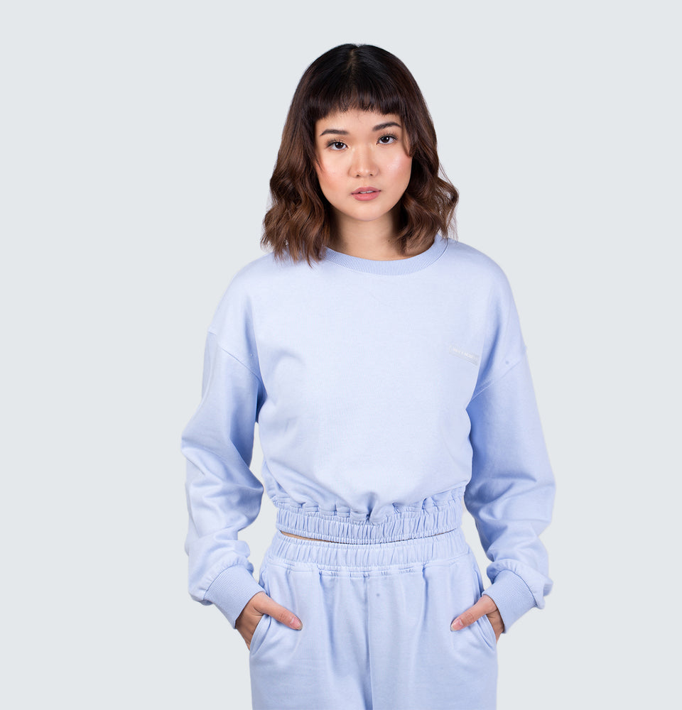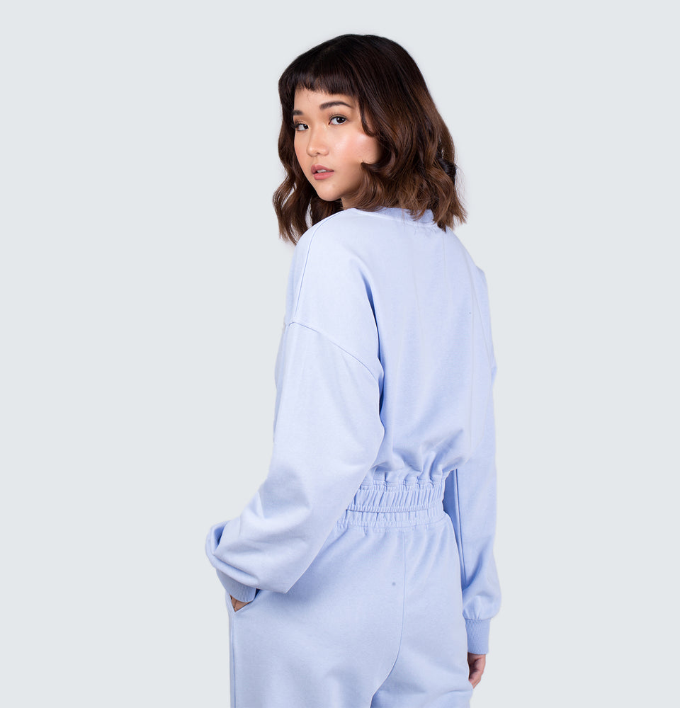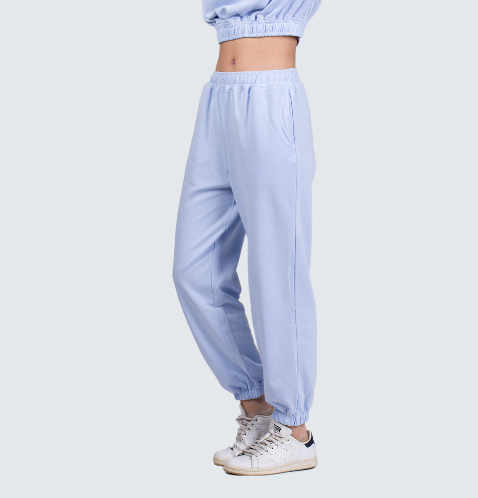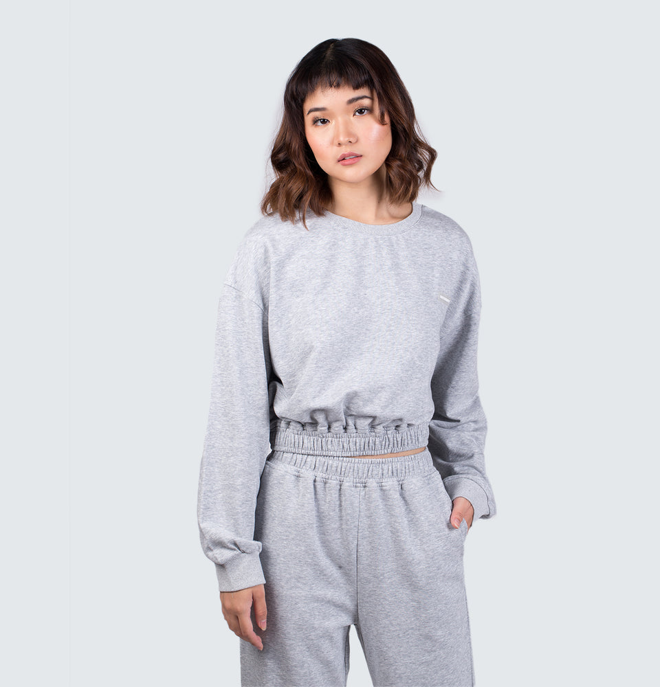 Description: Long sleeve sweatshirt with a round neckline and high-waist trousers featuring and elastic waistband, side pockets and elastic cuffed hems.